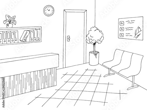 Hospital reception graphic black white lobby interior sketch illustration vector white lobby interior reception at hospital. Medical waiting room furniture also known as healthcare lobby furnishings are designed to keep patients including children feeling welcomed and comfortable while they wait for their appointments. The title receptionist is attributed to the person who is employed by an organization to receive or greet any visitors patients or clients and answer telephone calls.