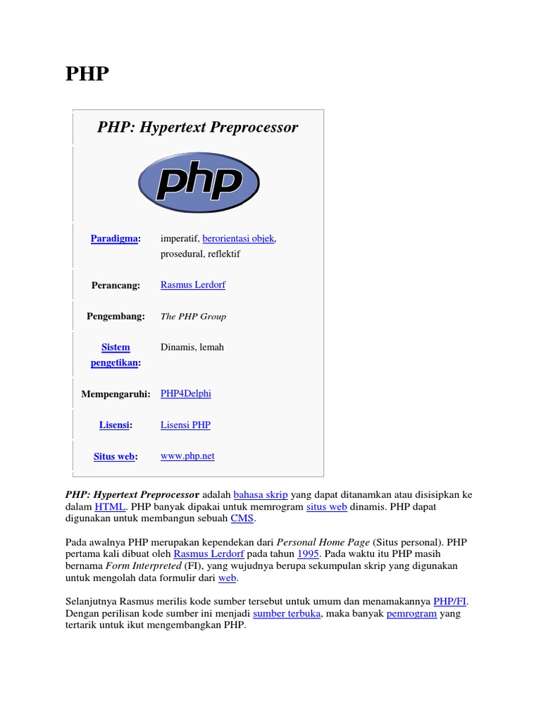 Pengertian php sejarah dan fungsi php personal home page dalam pemograman web lengkap php atau personal home page adalah sumber bahasa pemrograman di server yang digunakan untuk mengatasi masalah dan pengembangan suatu web dan bisa digunakan bersamaan dengan html hypertext markup language. Originally used for tracking visits to his online resume he named the suite of scripts personal home page tools more frequently referenced as php tools. The php reference implementation is now produced by the php group.